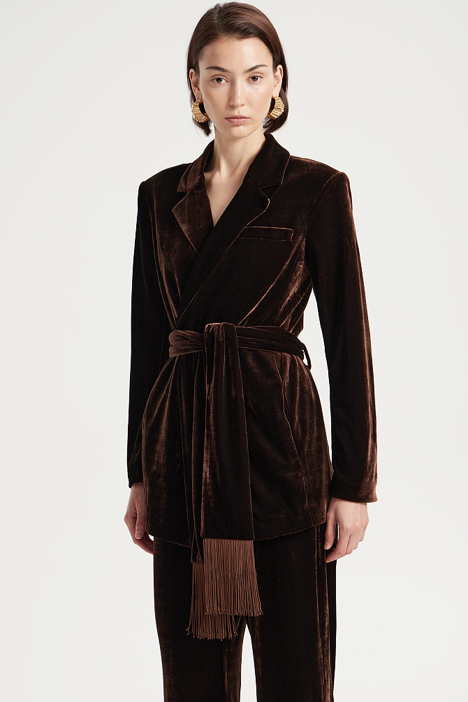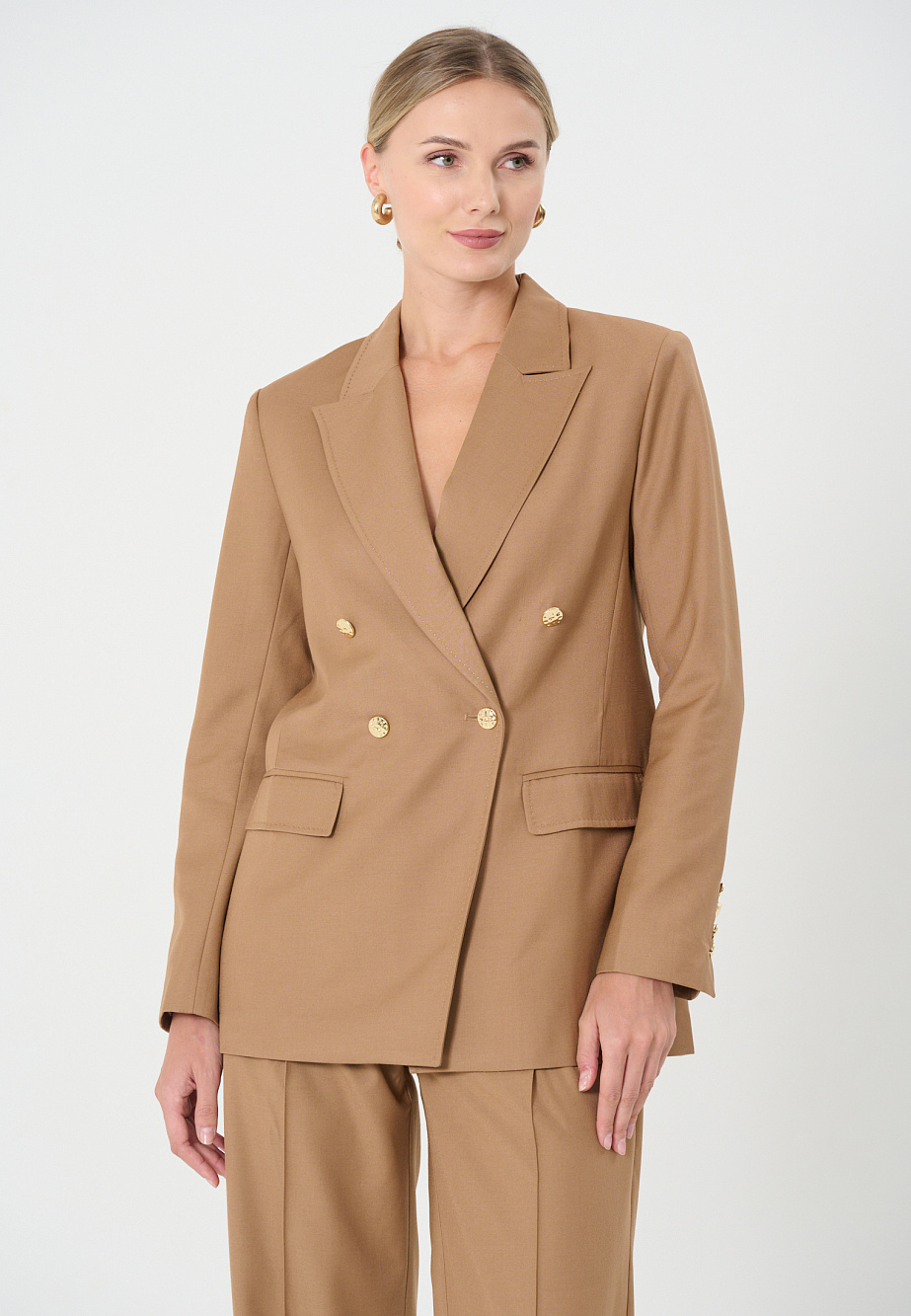 Базовый двубортный жакет из костюмной ткани с содержанием шерсти и района в осеннем оттенке кэмэл. Расслабленный крой жакета позволяет его носить не только в классическом варианте, но и миксовать с джинсами или платьями из легких тканей. Статусность и элегантность жакету придают золотая фурнитура и отстрочка по борту и др.деталям.Расширенная линия плеч,свободный крой и длина до середины бедер -особенности актуального жакета, который выберет современная девушка.
