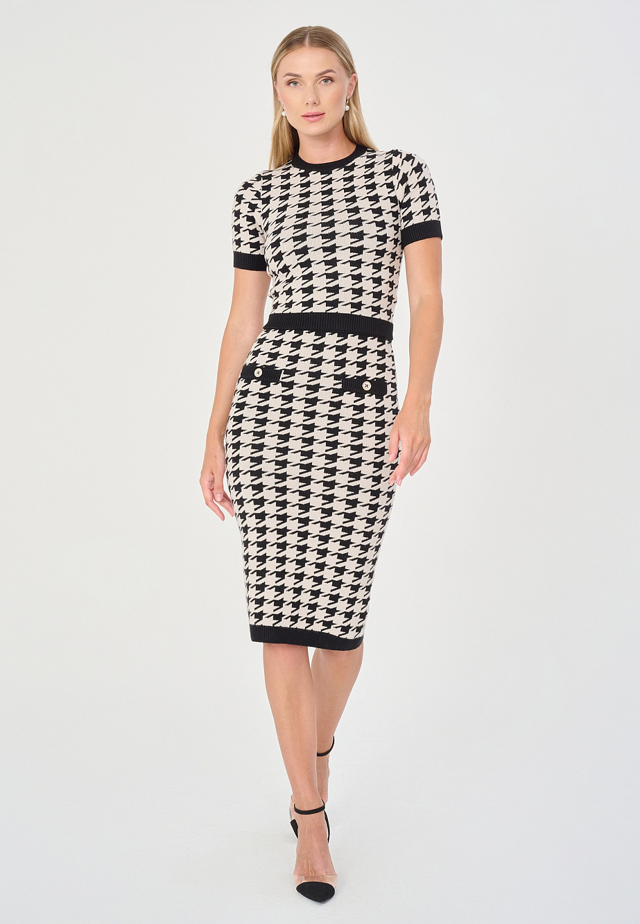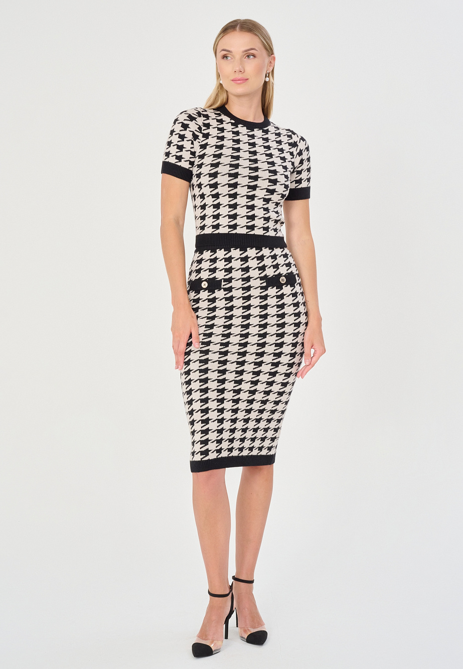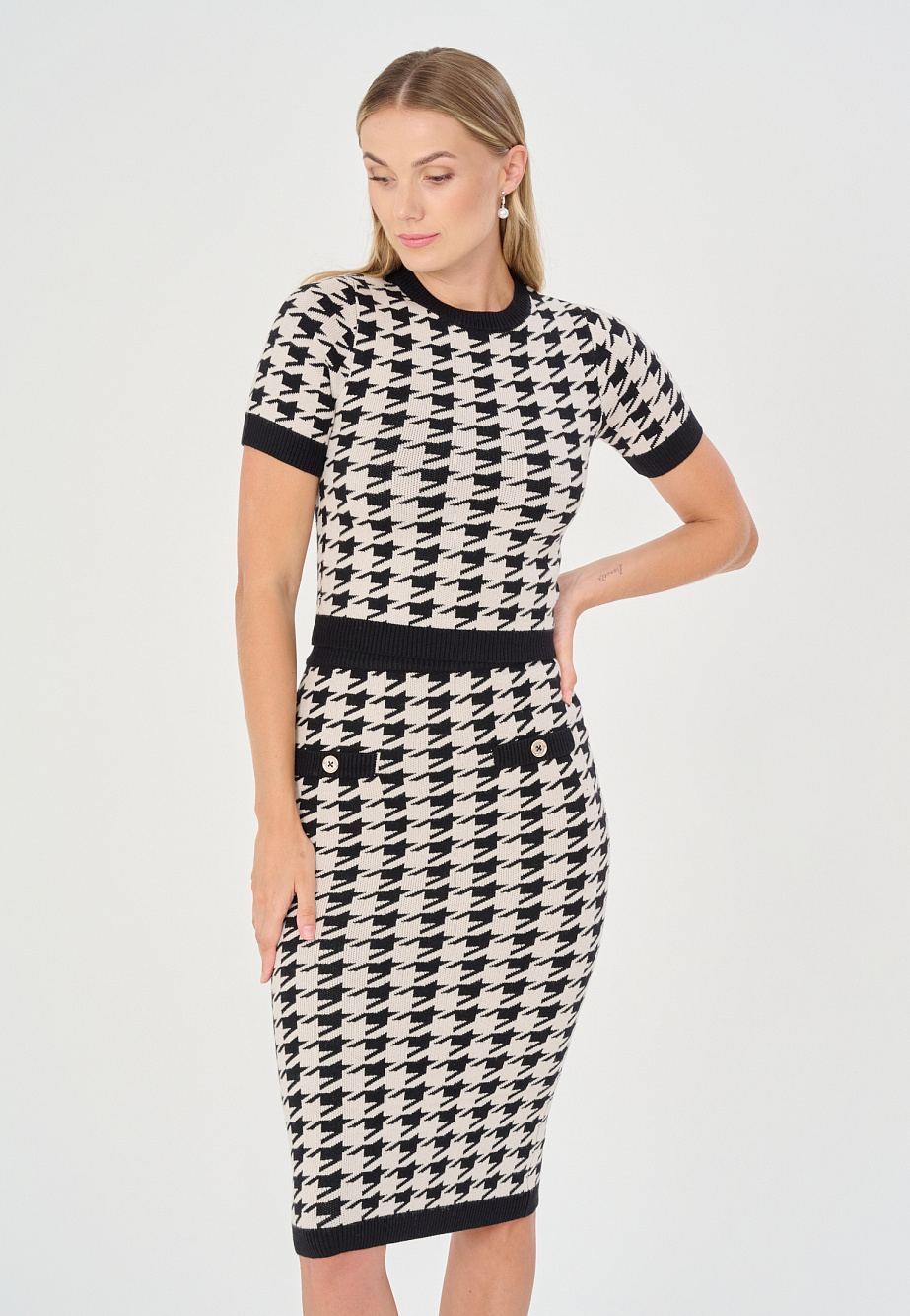 Трикотажный жакет в рамках классического образа из пряжи с жаккардовым переплетением и принтом пье-де-пуль, создает женственный и стильный силуэт с нотками изысканного стиля Жаклин Кеннеди. Плотный двойной трикотаж,укороченный топ в сочетании с юбкой миди, графичный рисунок и зауженный силуэт отлично подчеркивают женственные пропорции и дарят ощущение элегантности и неповторимое чувство стиля.