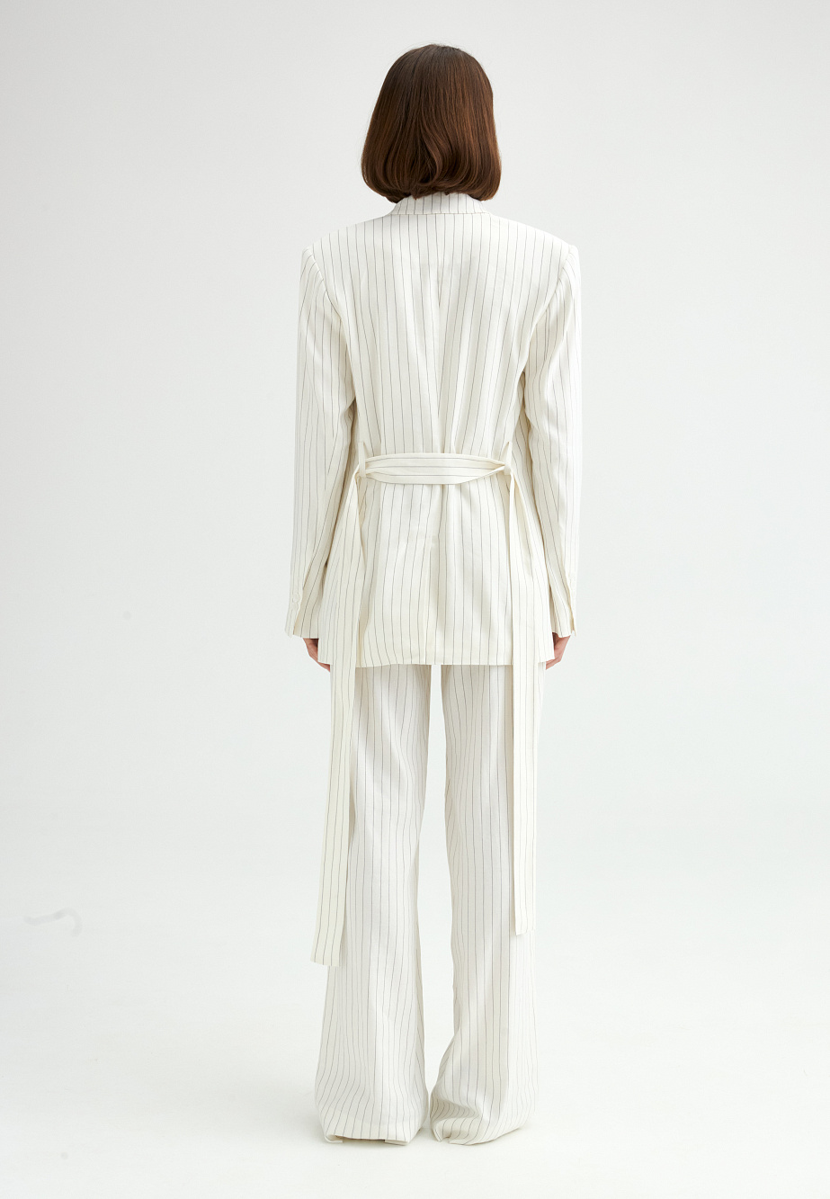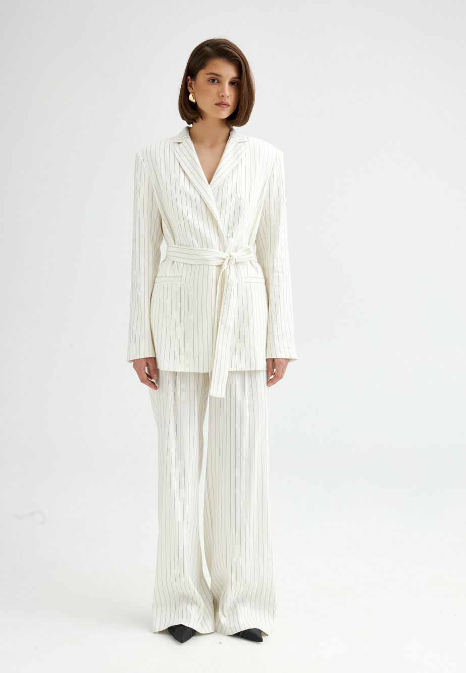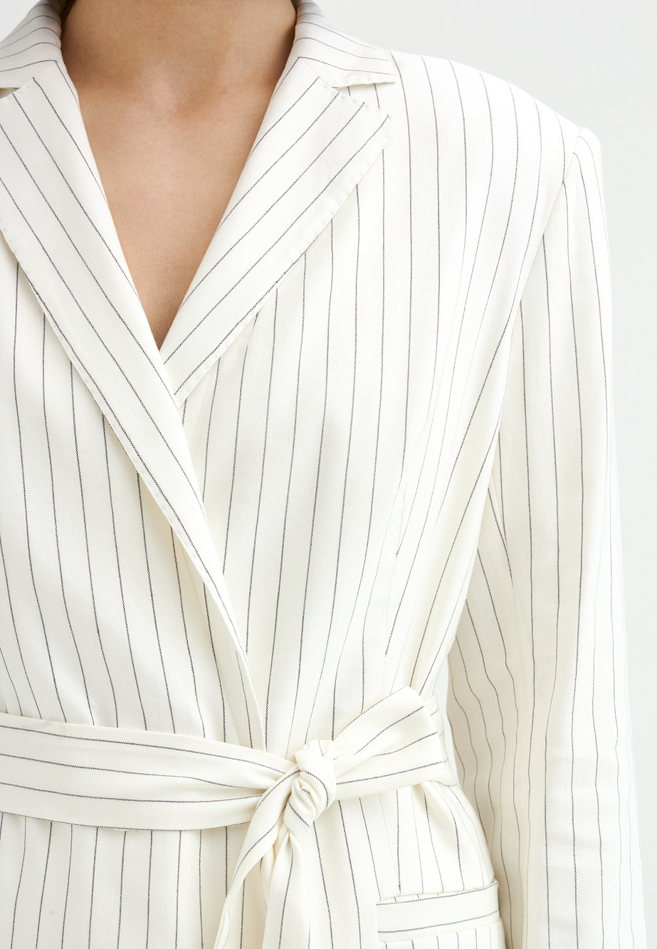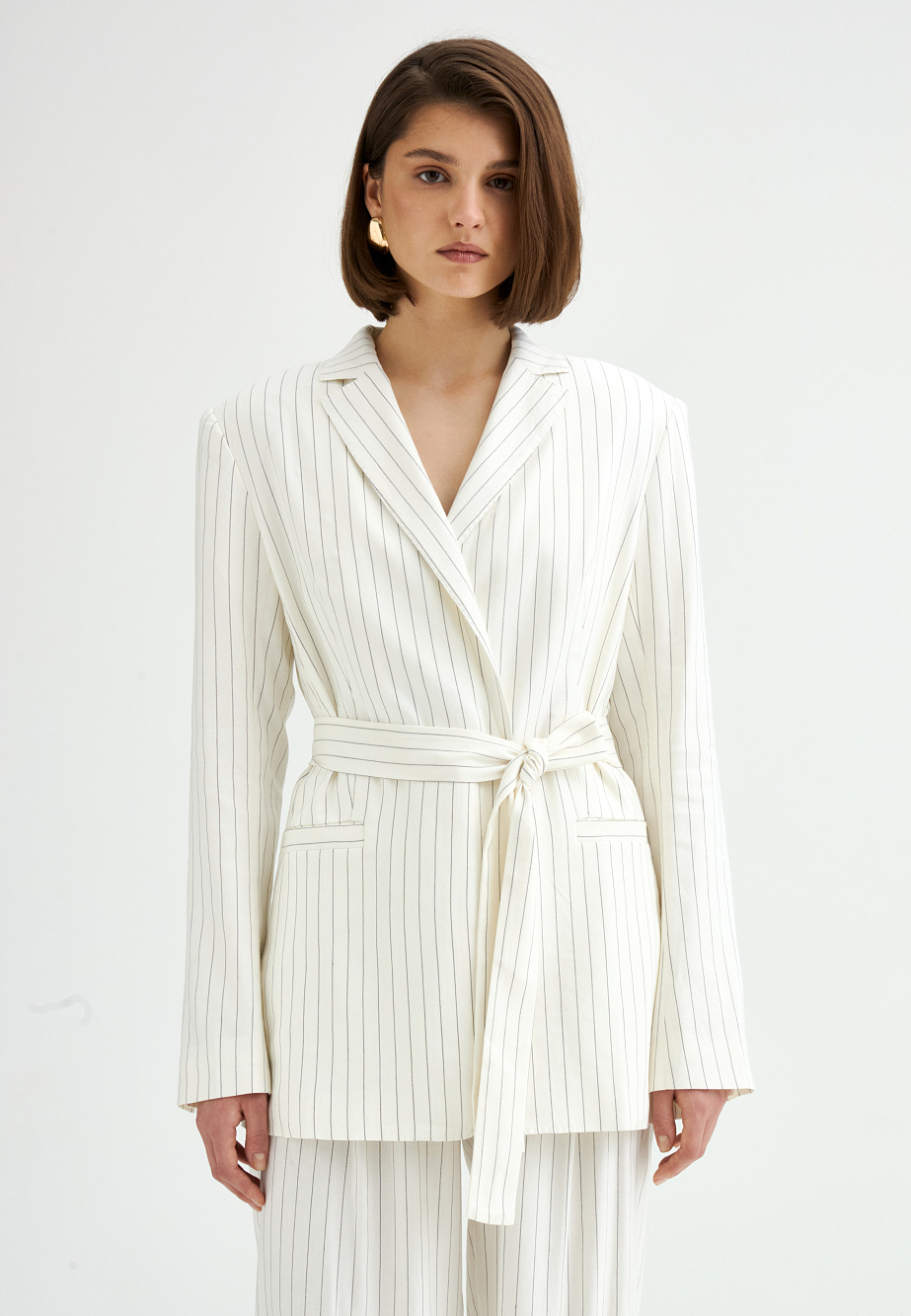 Двубортный жакет свободного силуэта из летней смесовой ткани, мягкий, облегченный, но с акцентом на плечи в виде подплечников. По краю лацканов и борта ручная строчка придает статусность и ценность этой вещи. К жакету предусмотрен завязывающийся пояс, который способен изменить образ и подчеркнуть вашу талию. Жакет выполнен полностью на вискозном подкладе, приятном и комфортном. Льняной состав и завязывающийся пояс придают жакету расслабленный и неофициозный вид.