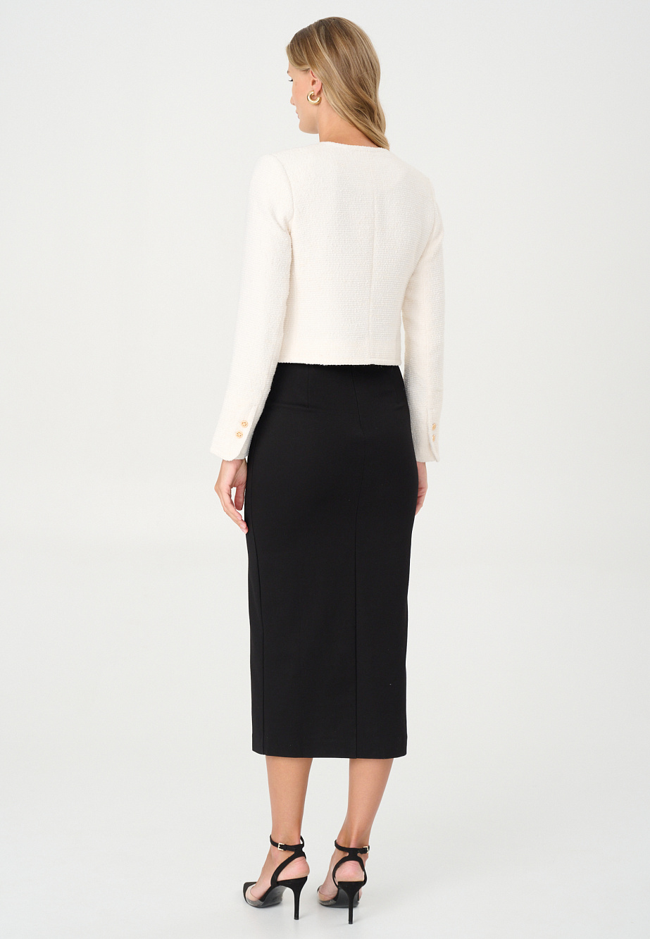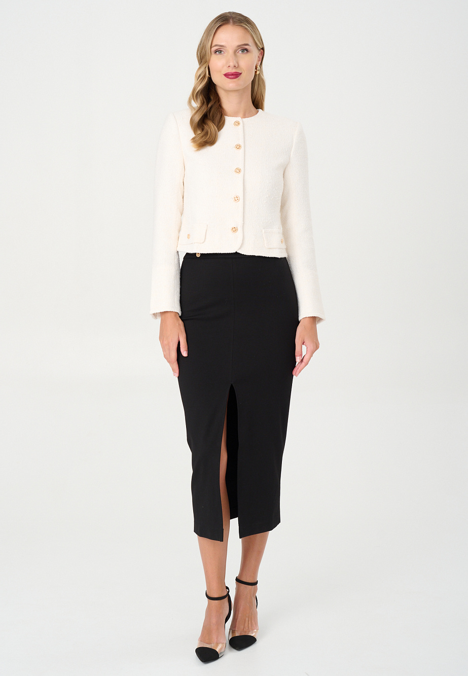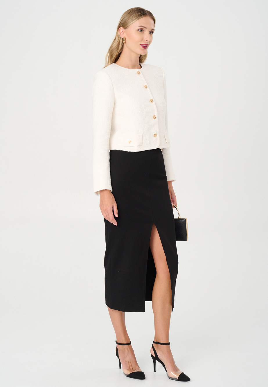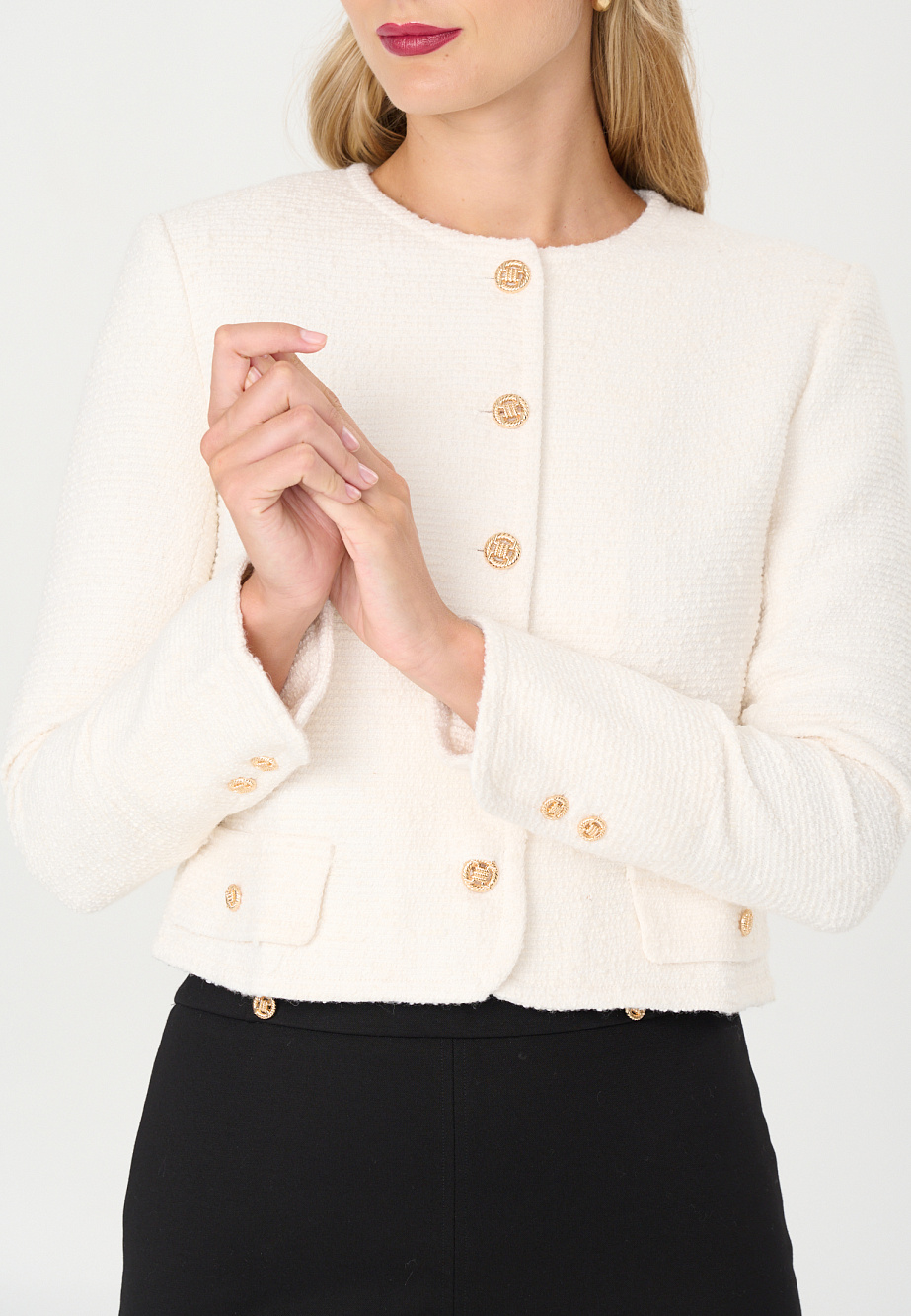 Укороченный твидовый жакет в стиле Шанель безупречного молочного оттенка,с расширенной линией плеч, поможет создать модный и актуальный образ на любое событие. Традиционные детали жакета и отделочные золотые пуговицы помогают сохранить узнаваемый стиль,f содержание шерсти в составе и качество твида убеждают в функциональности и долгосрочности вложений. Идеальным компаньоном жакета станет юбка длины миди или мидокси, а также широкие брюки или джинсы актуального кроя.