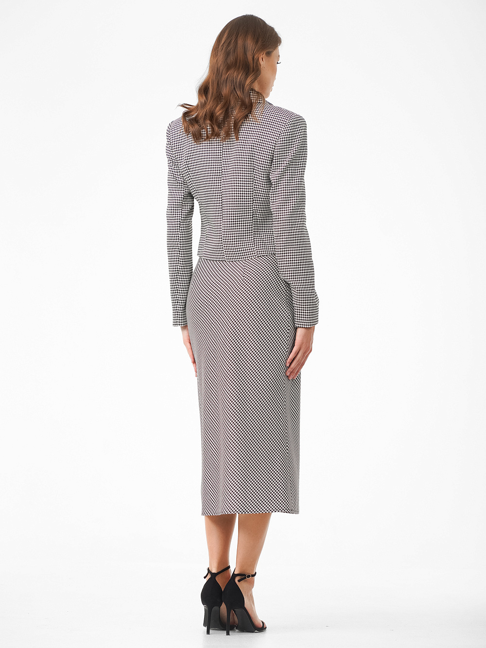 Костюм, состоящий из укороченного жакета и юбки длиной миди. Жакет приталенный и укороченный, с четкой линией плеча и выверенными пропорциями, прекрасно дополнит весенние образы и позволит разнообразить офисный строгий стиль. Стоит обратить внимание на четкость линий борта и лацканов, на фурнитуру- стильные пуговицы с металлическим ободком и на качественный и приятный к телу подклад. Слегка расклешенный книзу силуэт юбки и безупречная посадка достигается за счет кроя юбки по косой. Костюмная ткань- поливискоза с фактурным переплетением, очень пластичная и приятная на ощупь , хорошо держит форму и придает женственные очертания.