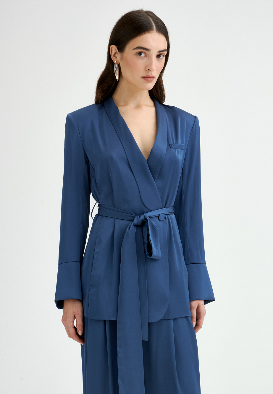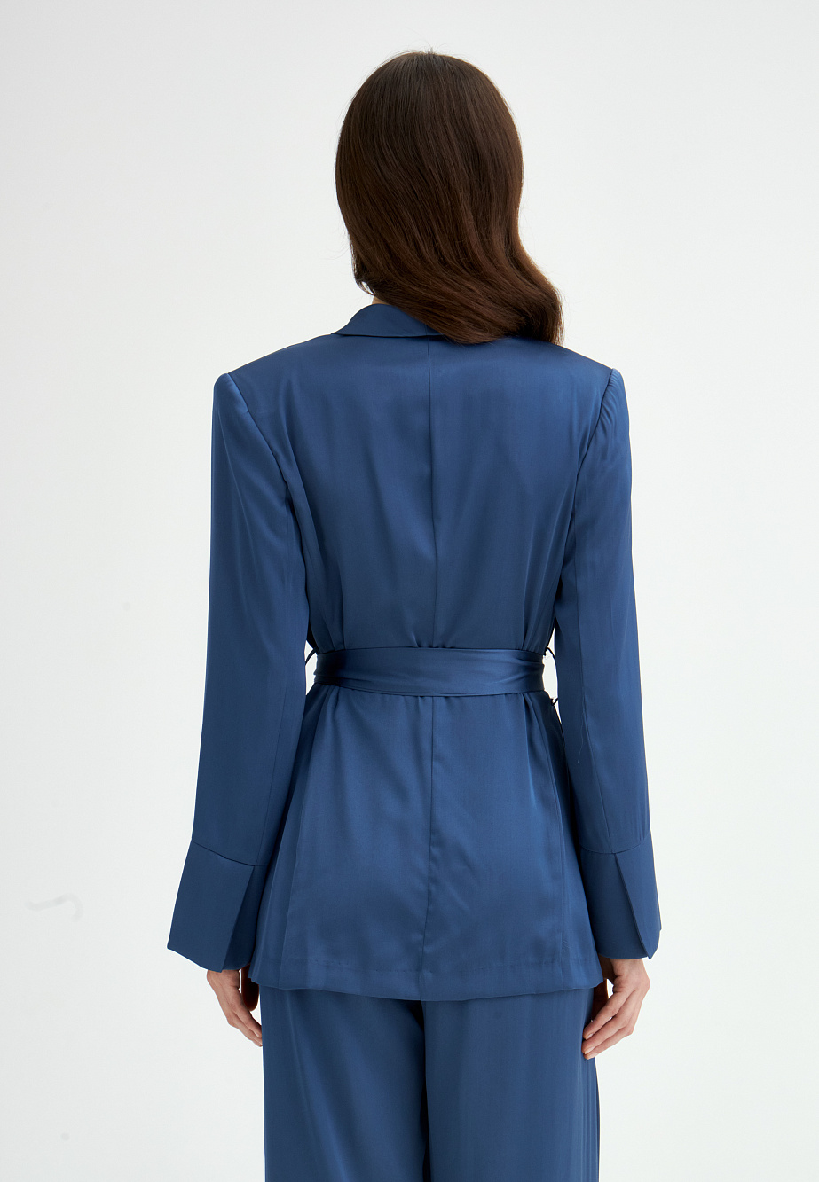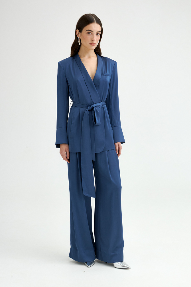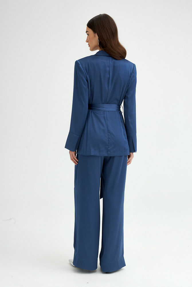Жакет свободного кроя из поливискозы с матовым сатиновым блеском и мягким шалевым воротником. Модель удлиненная, двубортная с застежкой на пуговицы и под пояс. Нагрудный карман, манжеты с шлицей и кантом, закругленная линия борта. В сочетании с брюками-палаццо идеально подходит для торжественного случая.