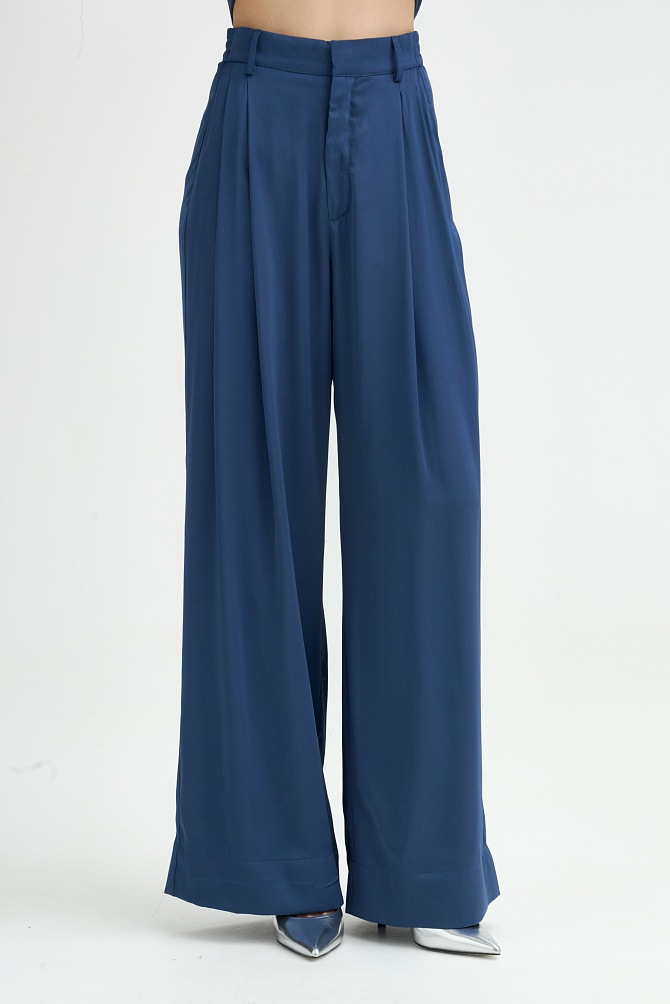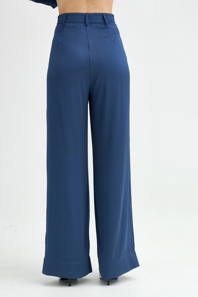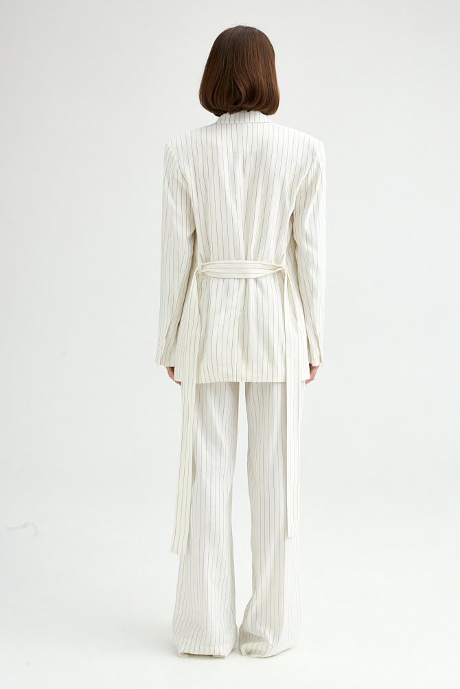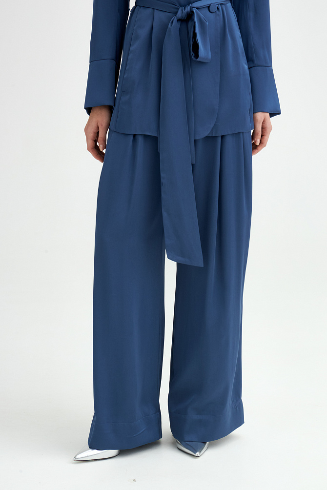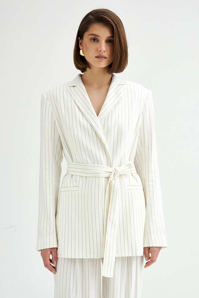Жакет свободного кроя из поливискозы с матовым сатиновым блеском и мягким шалевым воротником. Модель удлиненная, двубортная с застежкой на пуговицы и под пояс. Нагрудный карман, манжеты с шлицей и кантом, закругленная линия борта. В сочетании с брюками-палаццо идеально подходит для торжественного случая.