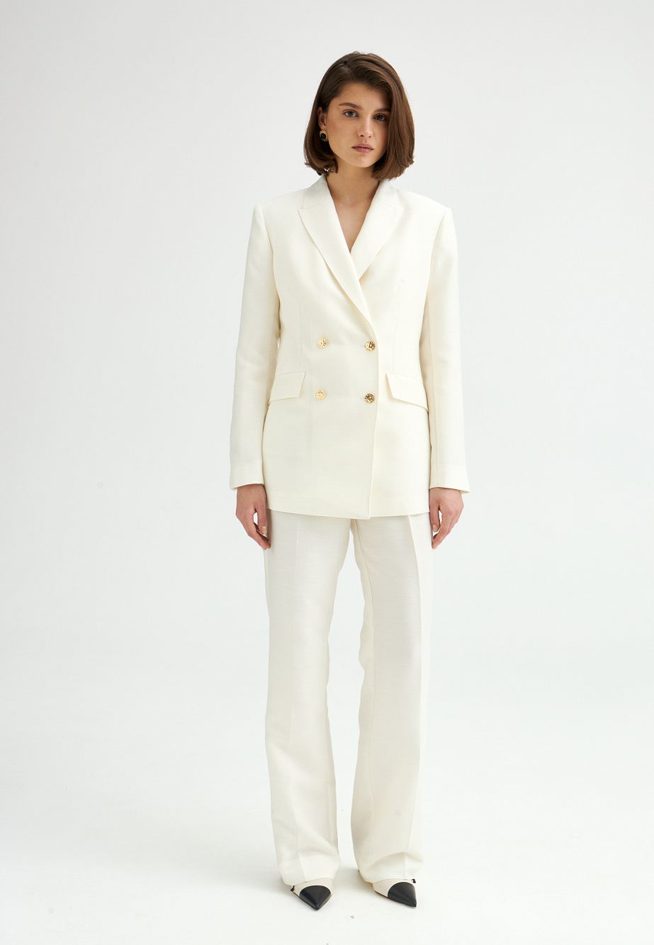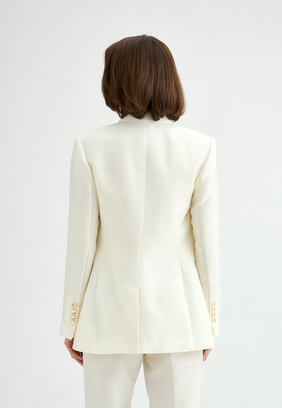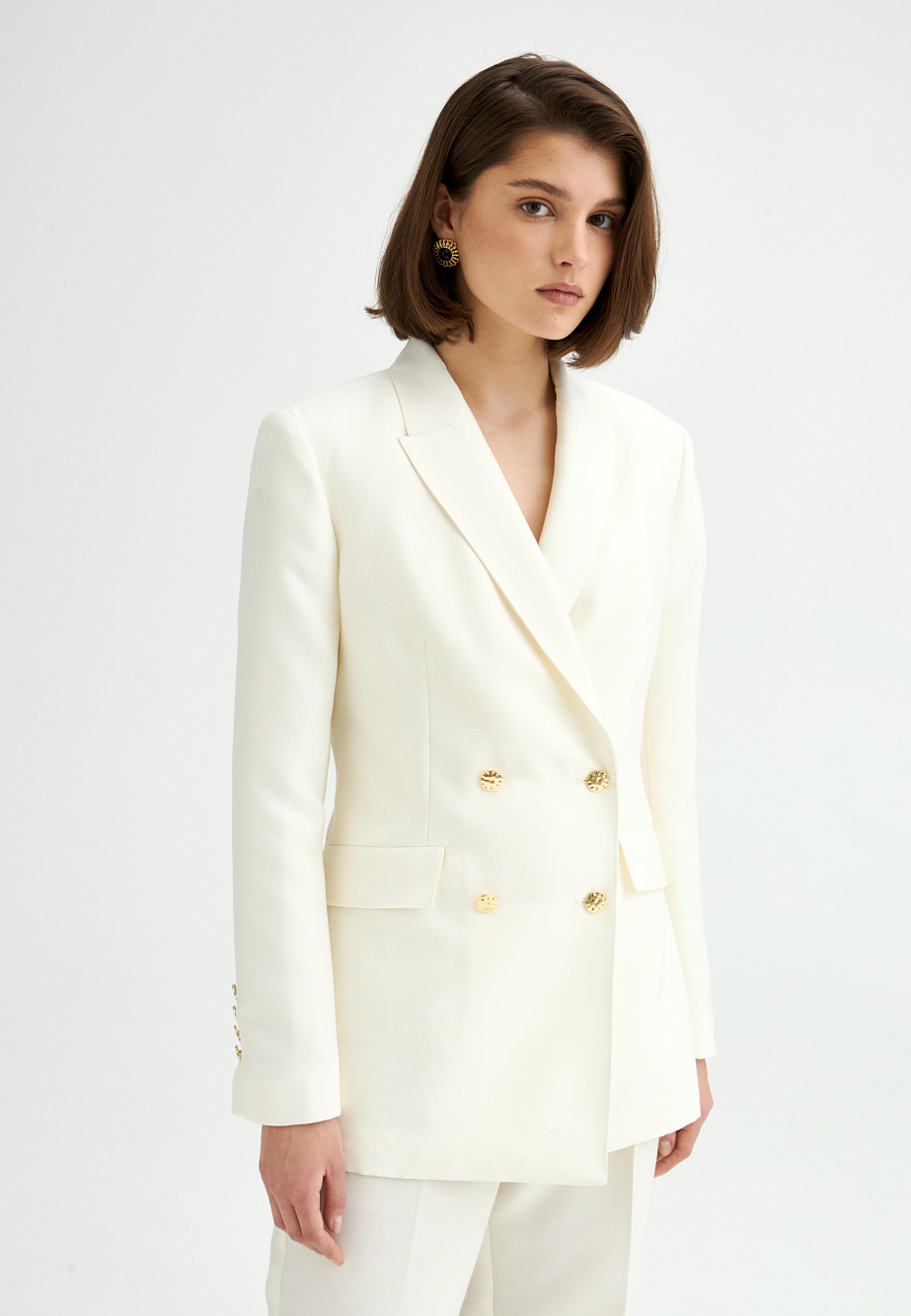 Жакет молочного оттенка из костюмной смесовой ткани с вискозой и шерстью, сохраняющей форму и благородную фактуру. Отделочная строчка, имитирующая ручной стежок, по краям лацканов и борта подчеркивает качество ткани и исполнения. Золотые пуговицы с эффектом чеканки придают нарядный вид. Подкладка из вискозы делает жакет удобным в теплый сезон.