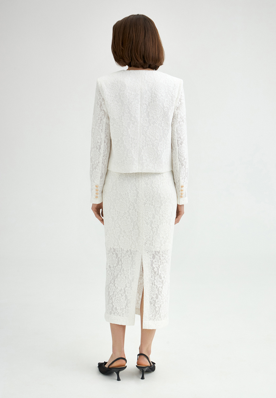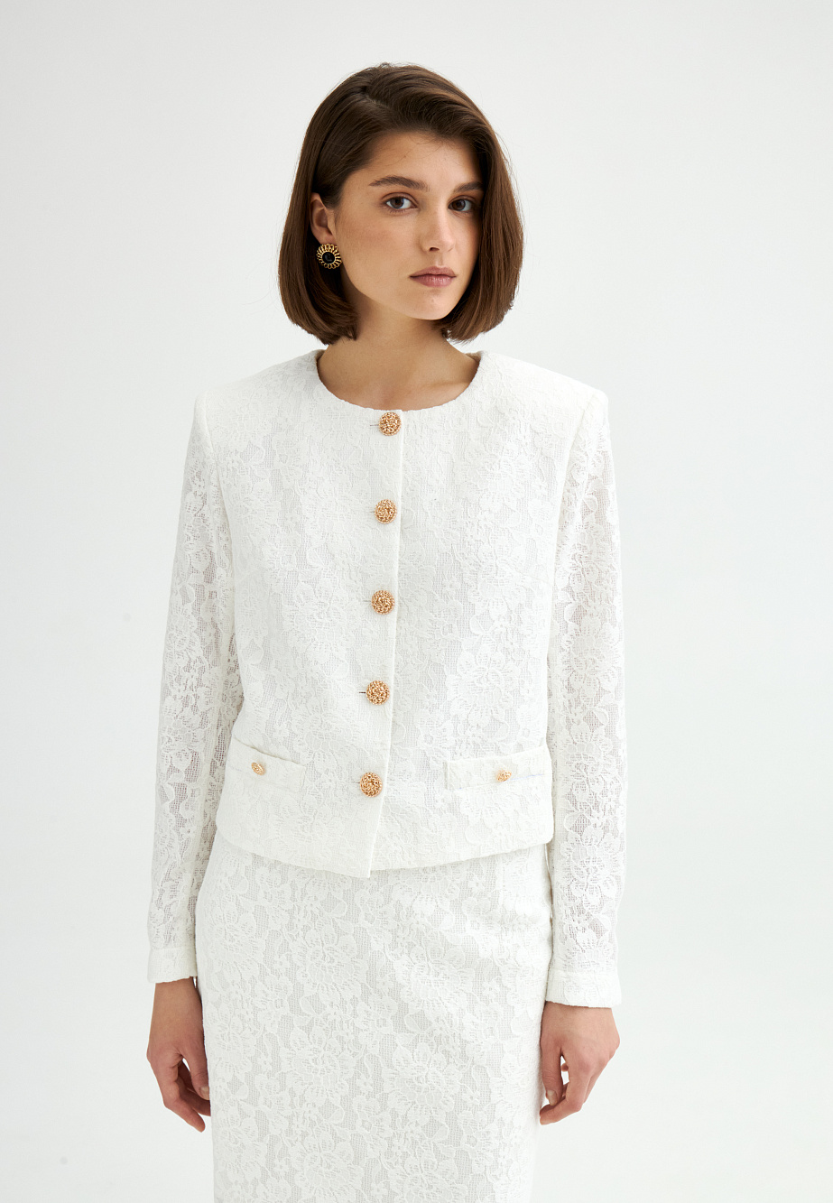 Укороченный прямой жакет из кружевной ткани с хлопком, создающей благородную фактуру. Легкость модели подчеркнута рукавами без подкладки и золотыми пуговицами. Лаконичный крой и молочный оттенок придают жакету статусность и вневременную эстетику. Жакет на подкладке, с круглым вырезом и имитацией карманов.