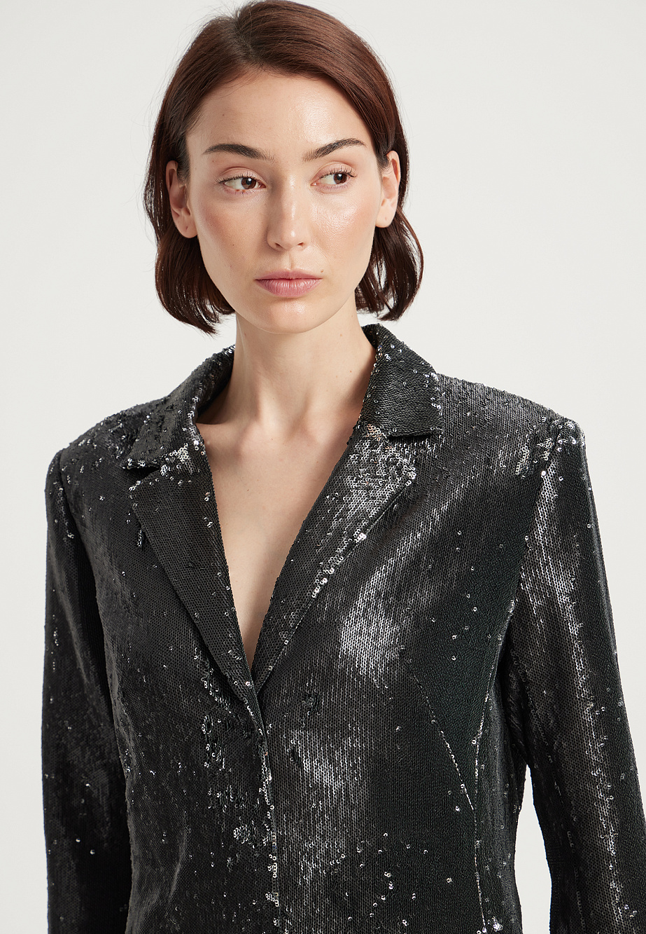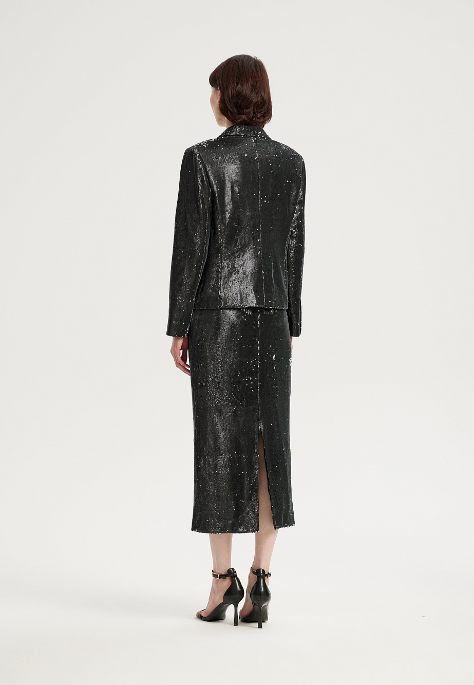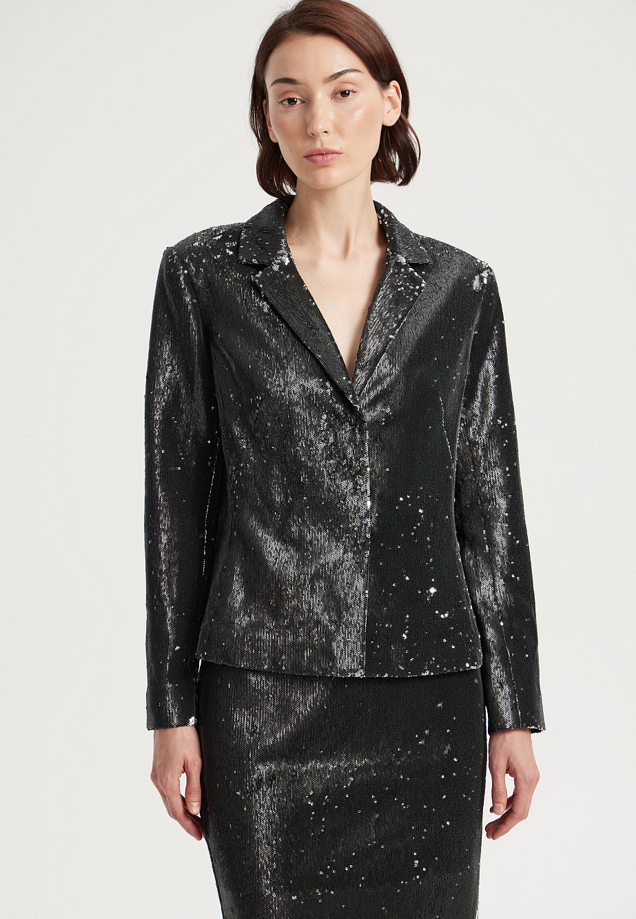 Элегантный жакет из ткани с декором из матовых двусторонних пайеток полуприлегающего силуэта. Модель застегивается на декоративные металлические кнопки. Жакет на подкладке. Парная юбка из той же ткани позволяет собрать безупречный комплект.