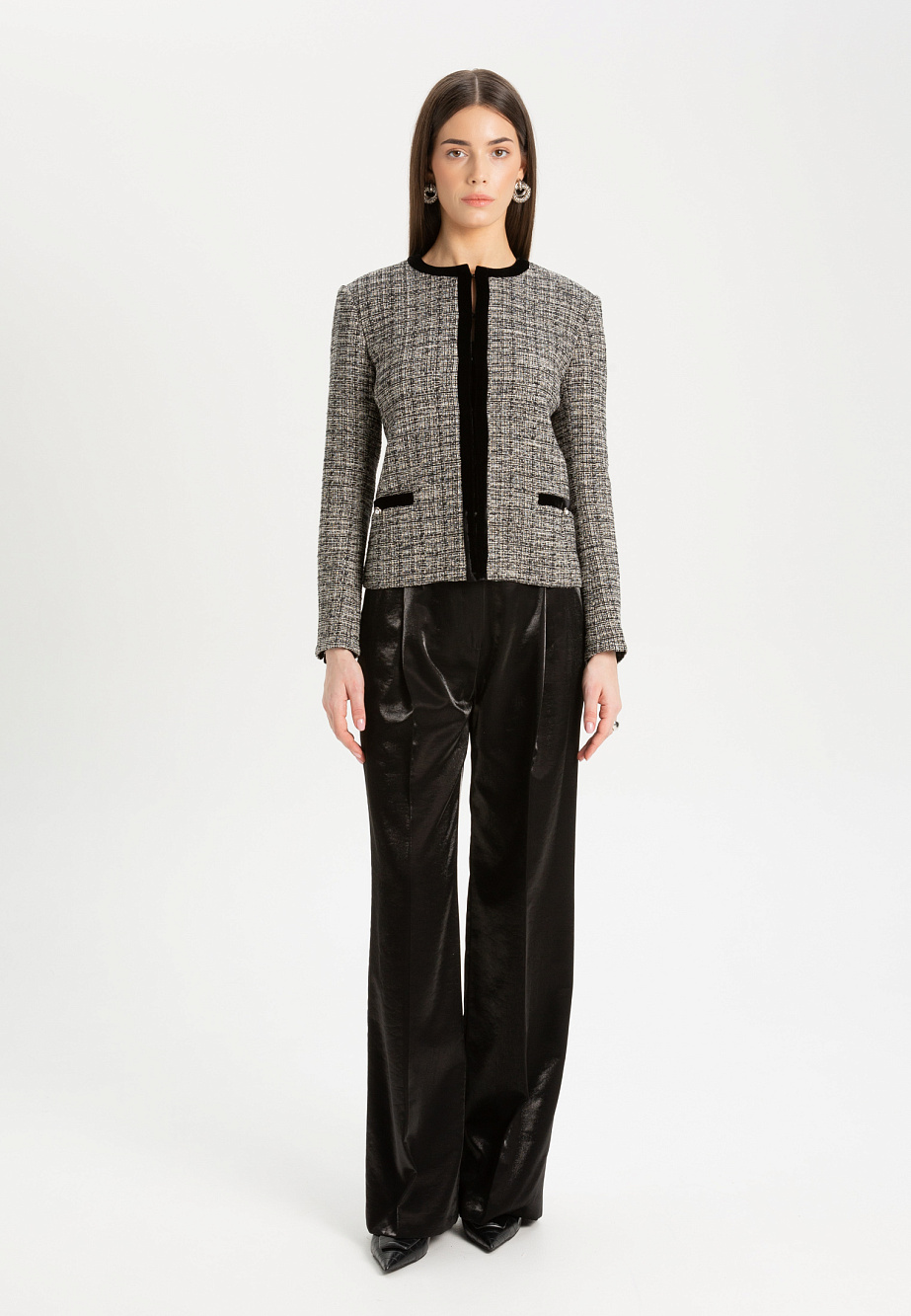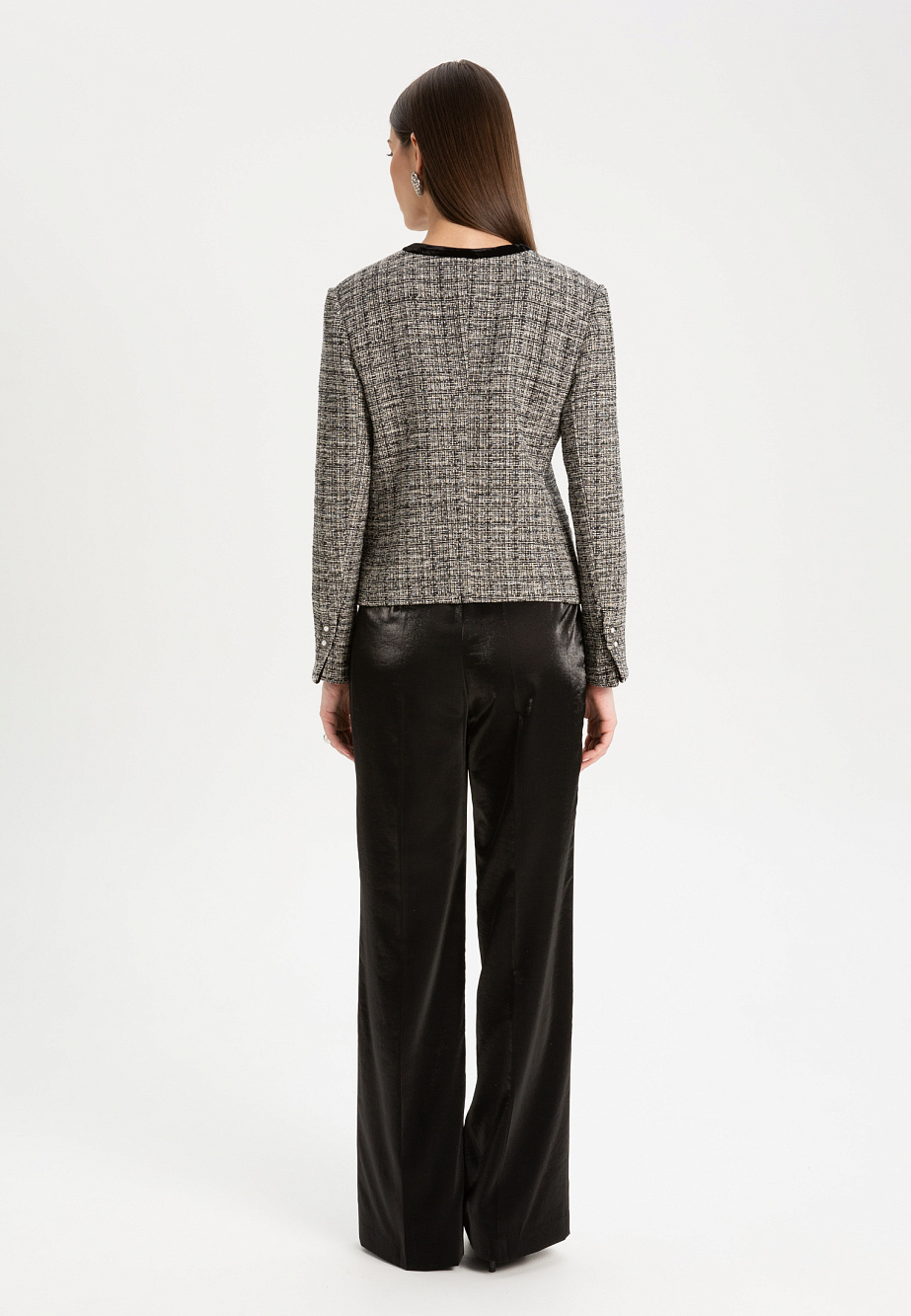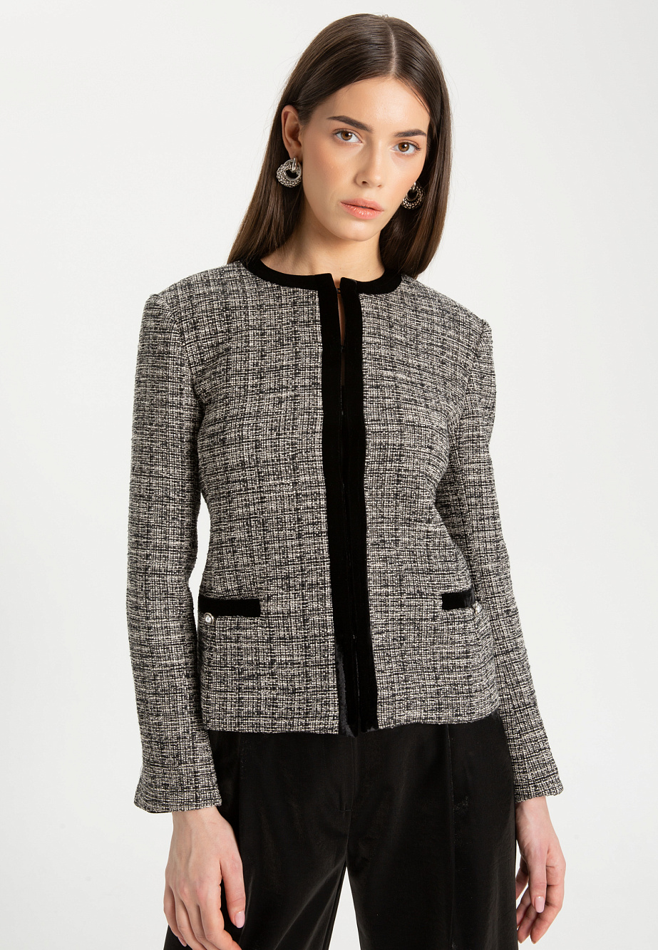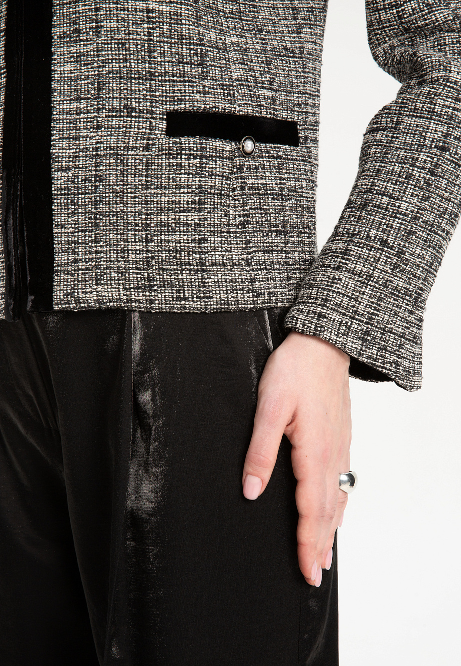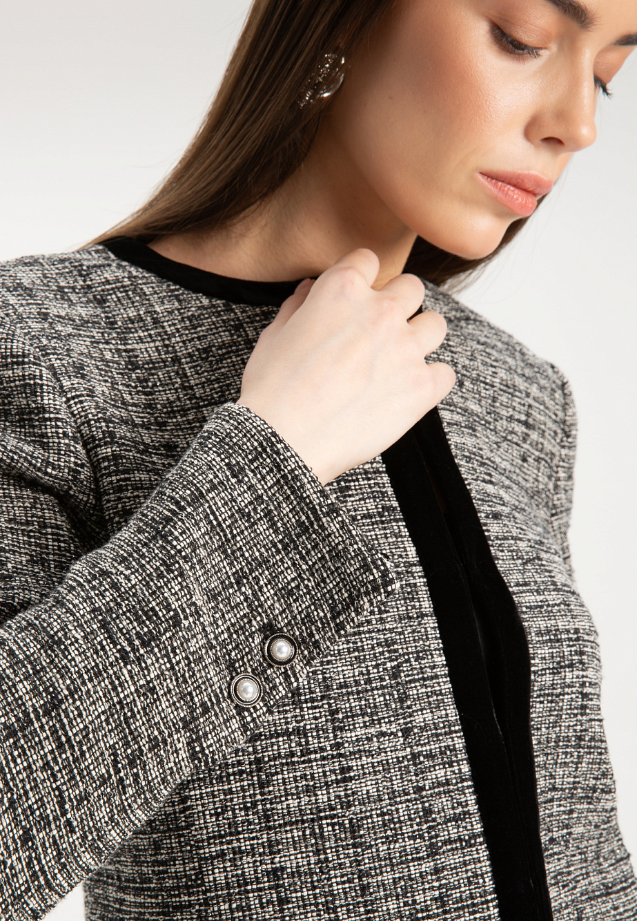 Укороченный твидовый жакет с бархатной отделкой — классика вне времени. Модель прямого силуэта с круглой горловиной застегивается на крючки и дополнена декоративными пуговицами на рукавах и карманах. Бархатная обтачка позволяет регулировать длину рукавов, а подкладка из вискозы обеспечивает комфорт в носке. Универсальная модель на каждый день и для особых случаев.