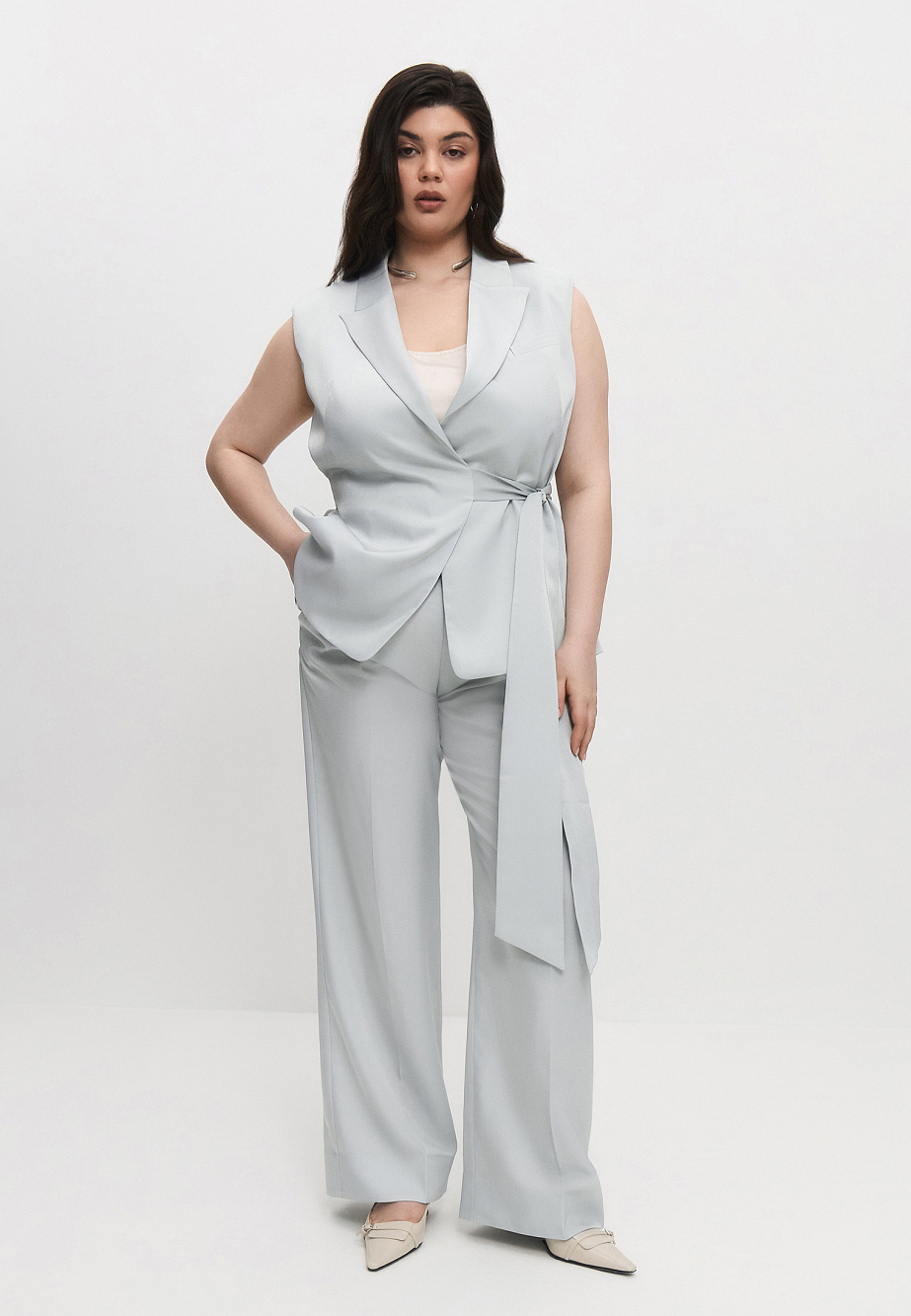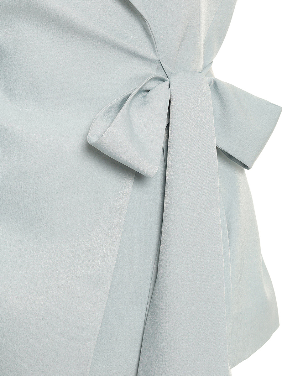 Свободный жилет из сатина с эффектом крэш, с застежкой на запах и поясом-бантом, регулирующим прилегание по талии. Модель с акцентными плечами и английским воротником, с карманами в боковых швах на подкладке из поливискозы.