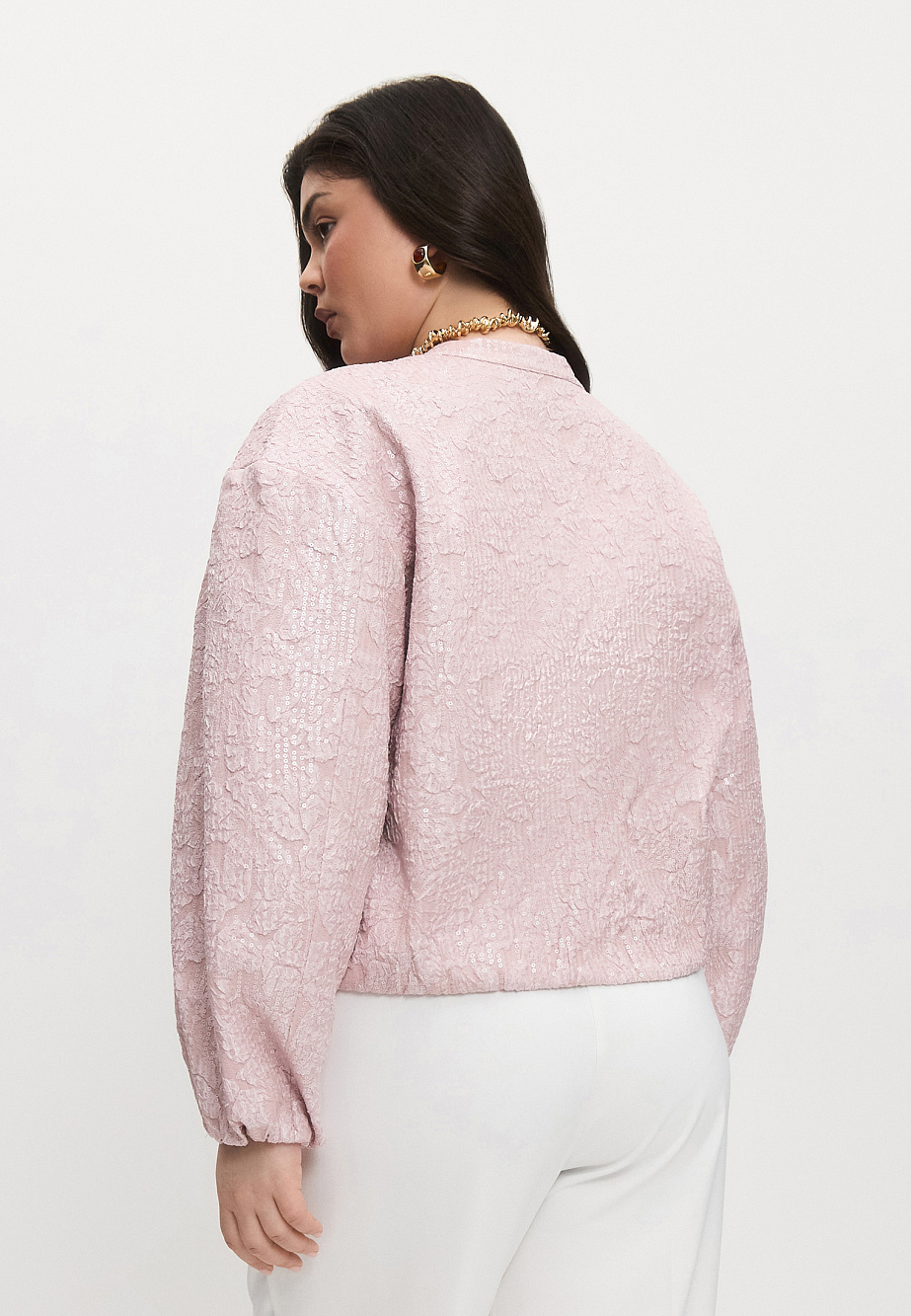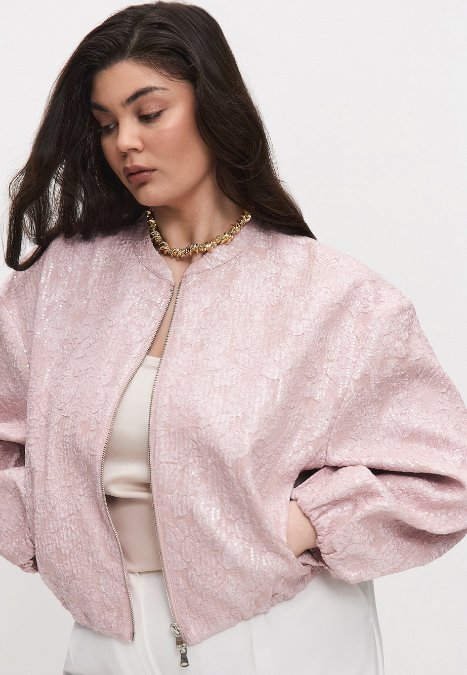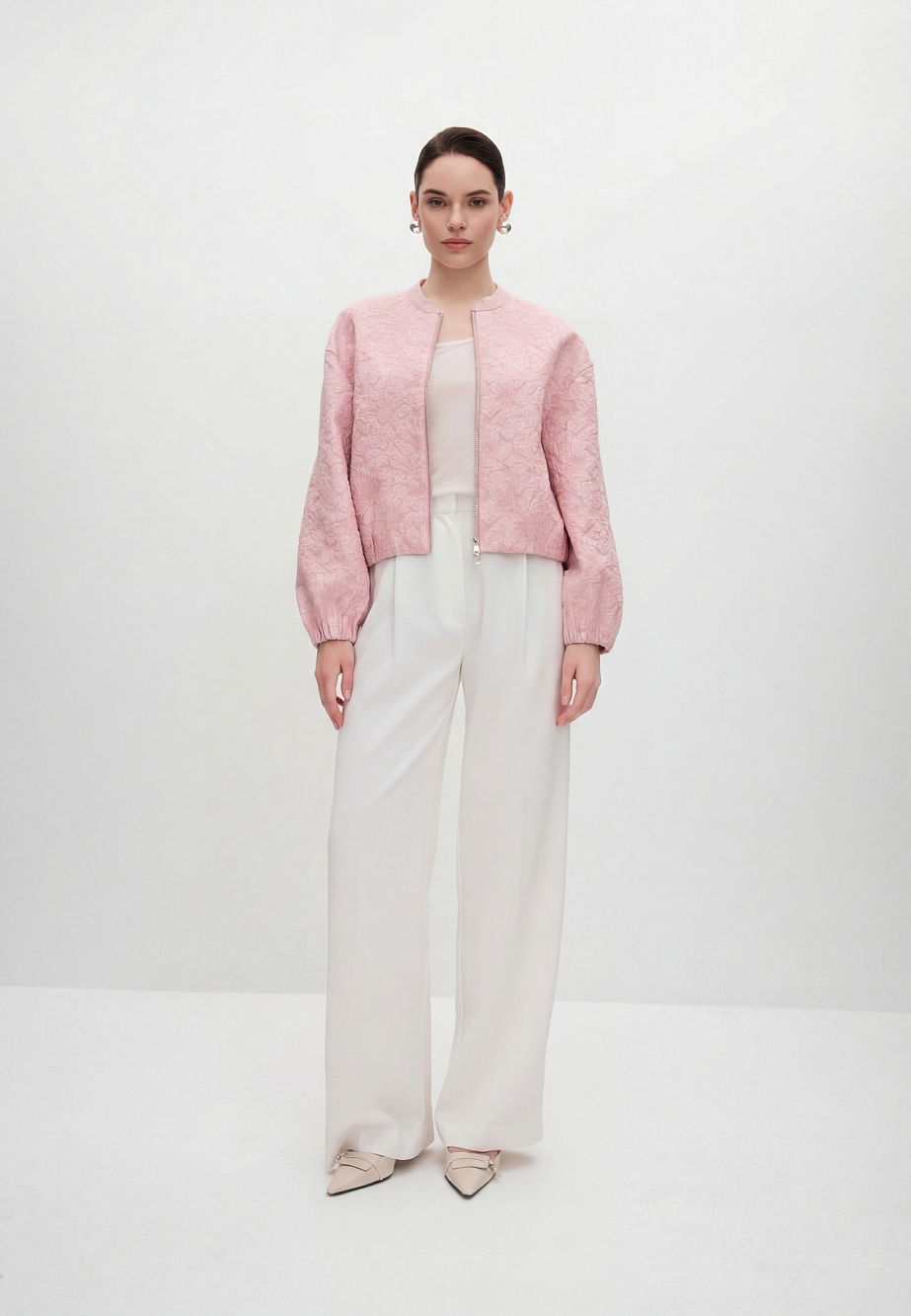 Бомбер - микс сочетания выразительной фактурной ткани с прозрачными пайетками и лаконичного кроя в духе sport chic. Легкая куртка на вискозной подкладке, свободного силуэта, с мягкой резинкой по низу и рукавам предназначена как дополнение к нарядным платьям, юбкам и брюкам из текущей коллекции. Карманы в боковых швах и двусторонняя металлическая молния с двумя бегунками для удобства носки, комфорта и универсальности.
