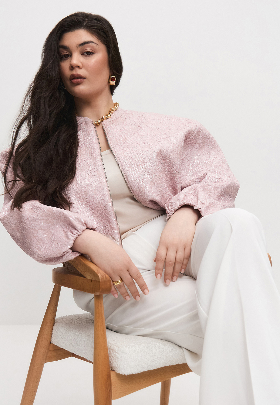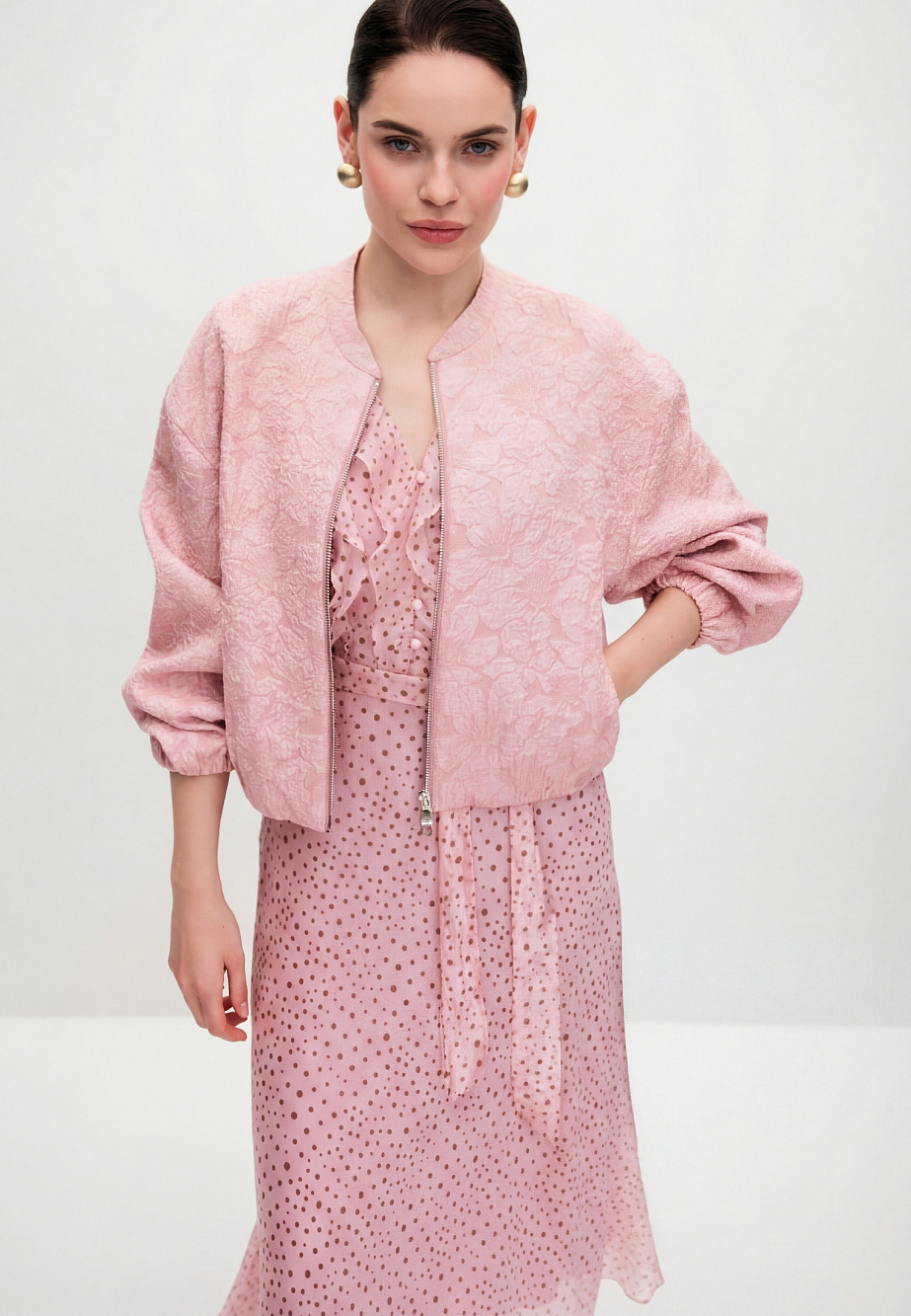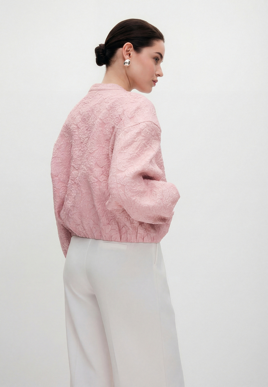 Бомбер - микс сочетания выразительной фактурной ткани с прозрачными пайетками и лаконичного кроя в духе sport chic. Легкая куртка на вискозной подкладке, свободного силуэта, с мягкой резинкой по низу и рукавам предназначена как дополнение к нарядным платьям, юбкам и брюкам из текущей коллекции. Карманы в боковых швах и двусторонняя металлическая молния с двумя бегунками для удобства носки, комфорта и универсальности.